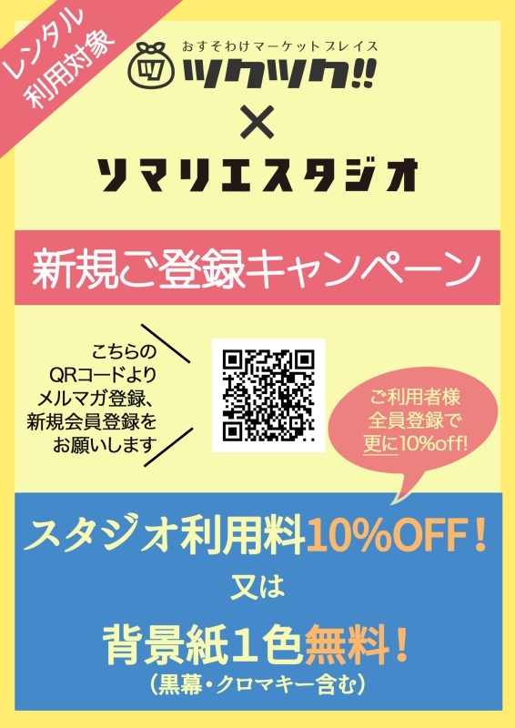 【スタジオ利用料10%off】又は【背景紙1色無料(黒幕、クロマキー含む)】