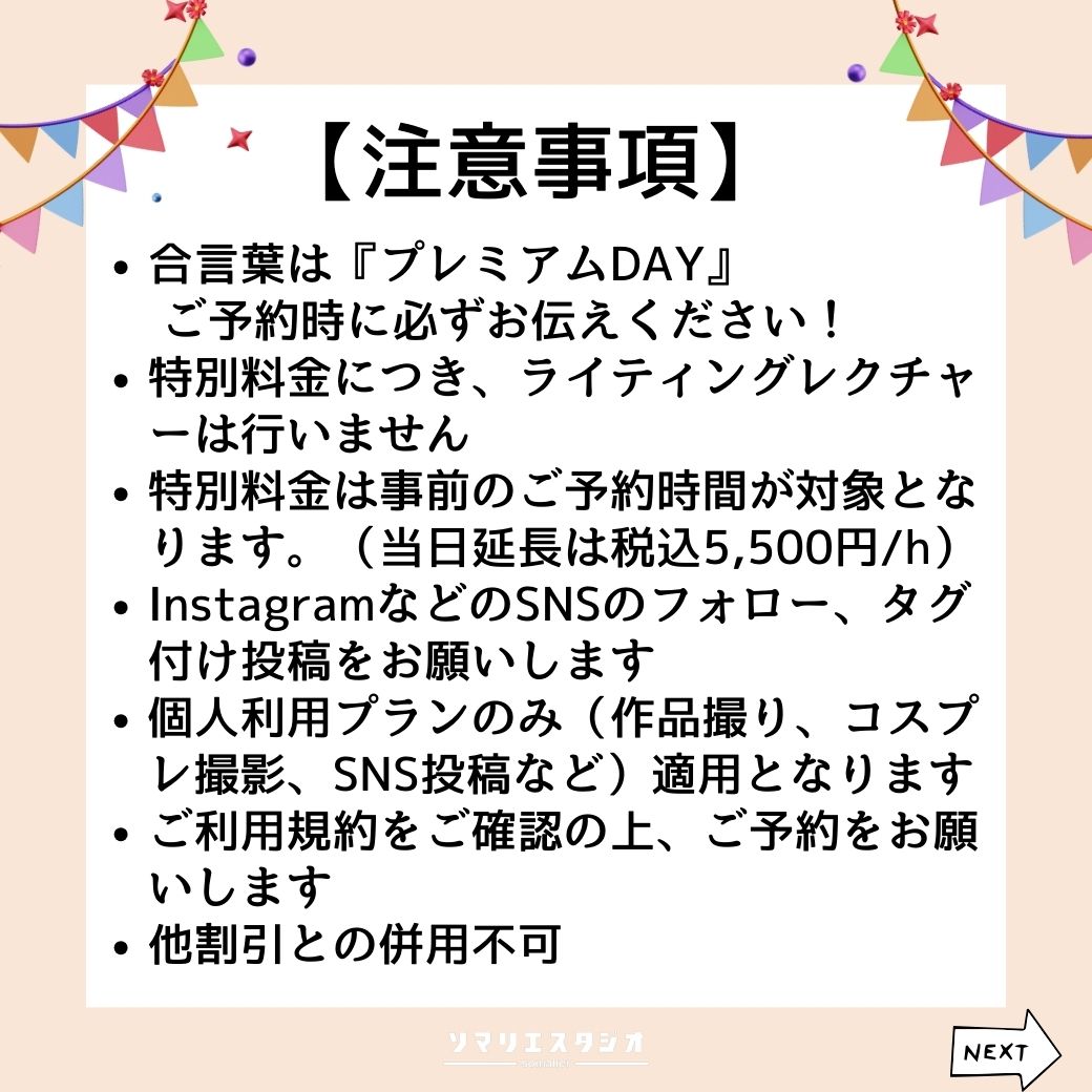 ・特別料金につき事前のご予約時間が対象となります(当日延長は¥5,500)