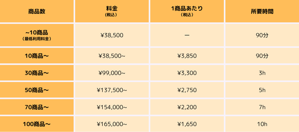 例)15商品の場合:¥38,500+¥3,850×5 =¥57,750